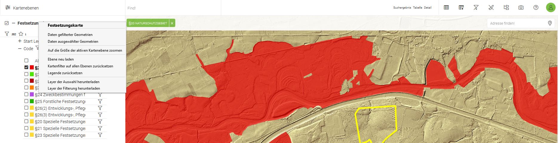 Über einen Rechtsklick auf den Schriftzug eines Layers kann ein Kontextmenü aufgerufen werden. Es kann u.a. die gefilterte oder selektierte Datentabelle geöffnet werden, es kann auf die Gesamtausdehnung des Layers (Kartenebene) gezoomt werden. Der Kartenfilter kann aufgehoben werden, die Legende kann zurück gesetzt oder der Layer gefiltert oder das Analyseergebnis der Auswahl (Selektion) kann im geometrischen GeoJSON-Format auf den Rechner heruntergeladen und gespeichert werden. Diese Möglichkeit besteht für alle Vektorlayer der Anwendung.