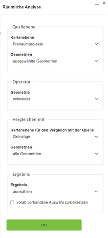 Zunächst ist die Quellebene, also der Layer, dessen Elemente selektiert werden sollen, auszuwählen. Hierzu werden im oberen Auswahlbereich alle Vektordaten zur Verfügung gestellt, Rasterdaten die in der Anwendung ebenfalls zur Verfügung stehen, können nicht gerechnet und selektiert werden. Ist hier die Auswahl durch den/die Anwender*in getroffen, lässt sich im nächsten Feld bestimmen, ob die Berechnung für alle Geometrien (Elemente des Layers) oder nur für ausgewählte oder gefilterte gelten soll. Im dritten Auswahlfeld von oben ist der Operator zu bestimmen. Standardeinstellung ist ‚schneidet‘. Soll eine Entfernung zu einem (oder mehreren) Elementen – wie ‚liegt in einem Kilometer um eine Stadt‘ – wird der Operator ‚schneidet mit ihrem Umfeld‘ genutzt und in dem anschließend erscheinenden Formularfeld der Abstand in Kilometern ausgegeben. Als viertes Auswahlfeld wird jetzt der Vektorlayer ausgewählt, mit dem der Quelllayer verglichen werden soll. Auch hier wird wieder im nächsten Schritt festgelegt, ob alle Elemente für die Berechnung herangezogen werden sollen oder nur die ausgewählten/gefilterten. Nachdem man die Form des Ergebnisses bestimmt hat (selektiert oder gefiltert) wird über Betätigung der grünen Schaltfläche der Prozess gestartet. Ein Fenster zeigt den Fortschritt der Berechnung. Sollte eine aufwendige Berechnung nötig sein, kann der/die Benutzer*in dennoch mit der Anwendung weiterarbeiten.